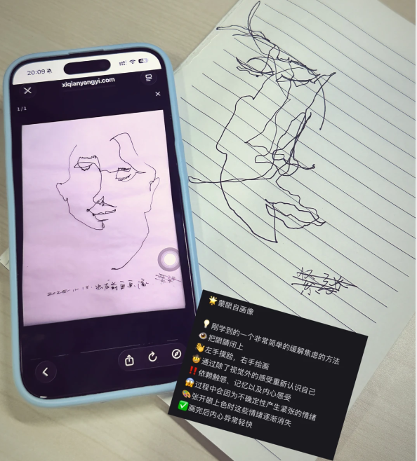 因此,蒙眼自画像特别适合那些比较容易焦虑的人群,能够提升情绪调控的能力,减少焦虑所带来的不愉快反应。