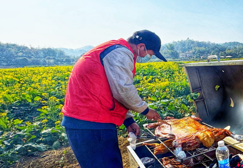 现场最具吸引力的莫过于烟火缭绕的特色美食,古法窑鸡、烤全羊,搭配烤番薯、玉米组成“硬核美味天团”,瞬间俘获众人味蕾。“一大早我们就备齐食材和土窑,叶总说今天客流大,特意准备了15个窑同步烤制。”正在忙碌的工作人员向记者介绍。游客们循着烟火气纷至沓来,纷纷在烤炉旁驻足围观,暂别城市的钢筋水泥与车水马龙,沉浸式感受土地的芬芳与田园惬意。